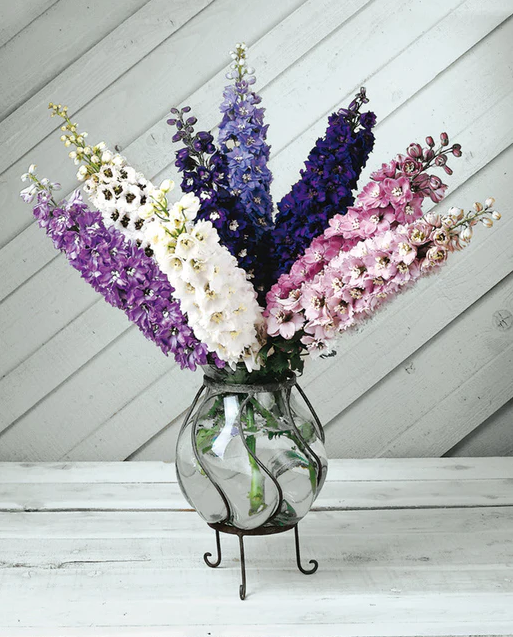Dwarf Pacific type delphinium perfect for small gardens. Magic Fountains attracts bees, butterflies, and hummingbirds with fantastic displays of semidouble pink, blue, lavender, and white flower spikes with dark and light “bees”, or centers. Compact plants do not need staking but should be sheltered from strong winds. Perennial plants grow 90-120cm (36-48") tall.