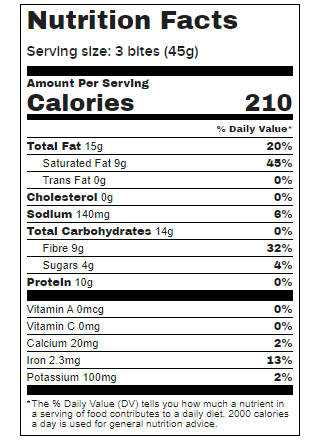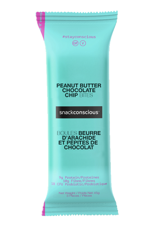 SnackConscious Peanut Butter Chocolate Chip Bites made with real chocolate and peanut butter. 1b probiotics 10 g protein 4 g Sugars 10 g fibre Veg...